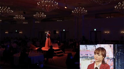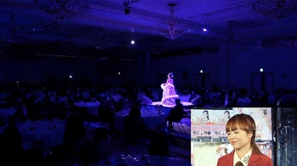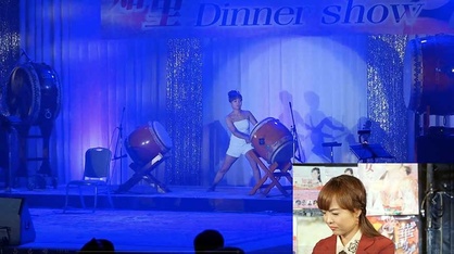 ディナーショーの模様は全画面で映し出され、右下に小画面でスタジオで撮影中の知里の顔が映し出されている。そうした技法をワイプと呼ぶようである。