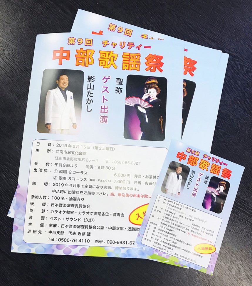 先日、歌謡教室の講師から中部歌謡祭のポスターとちらしを作って欲しいと依頼があった。