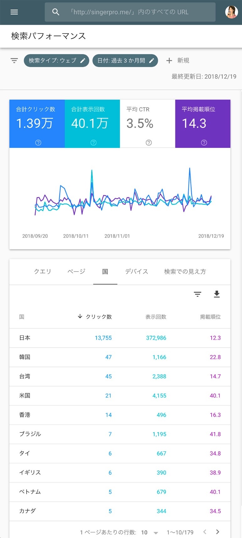 シンガープロサイトへの国別クリック数 2018年9月20日〜2018年12月19日