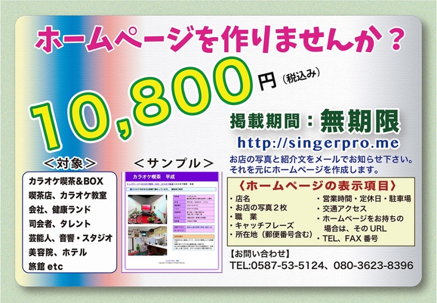 会社、お店、旅館、飲食店、芸能、スタジオ、音響のホームページを1万円でお作りします。掲載期間は無期限。スマートフォンに特化したホームページでわかりやすくきれいにお作りします。すでにホームページを開設していらっしゃる方でも、そちらにリンクを張るので、さらに訪問者が増えることが期待できます。いろいろなところに根を張らしておくことは有益です。