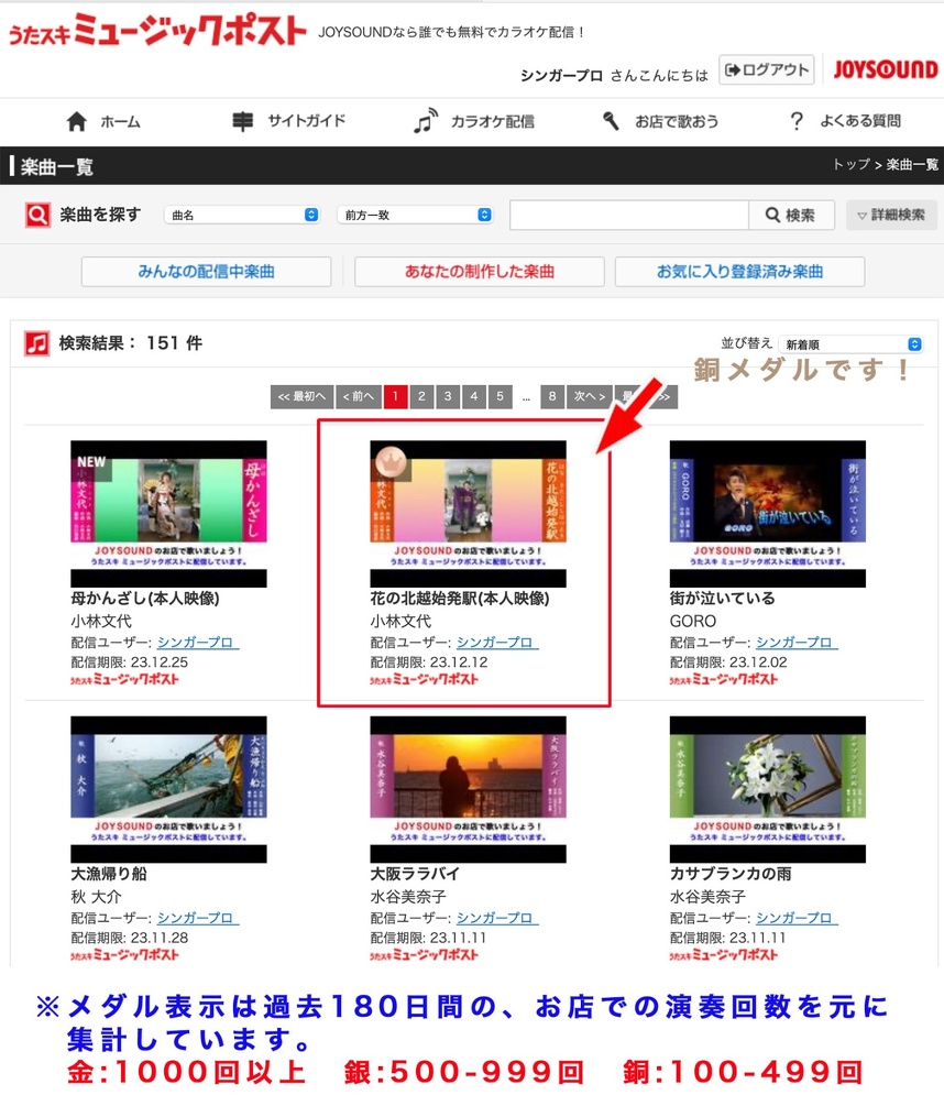 今、うたスキ ミュージックポストの私が代行配信した楽曲ページを見たら、小林文代さんの「花の北越始発駅(本人映像)」が銅メダルに輝いていたので、大変ビックリしました。