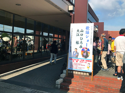 13時からの生放送で2時間前から会場の安八町中央公民館の玄関前に大勢の入場者が列をなして並んでいた。