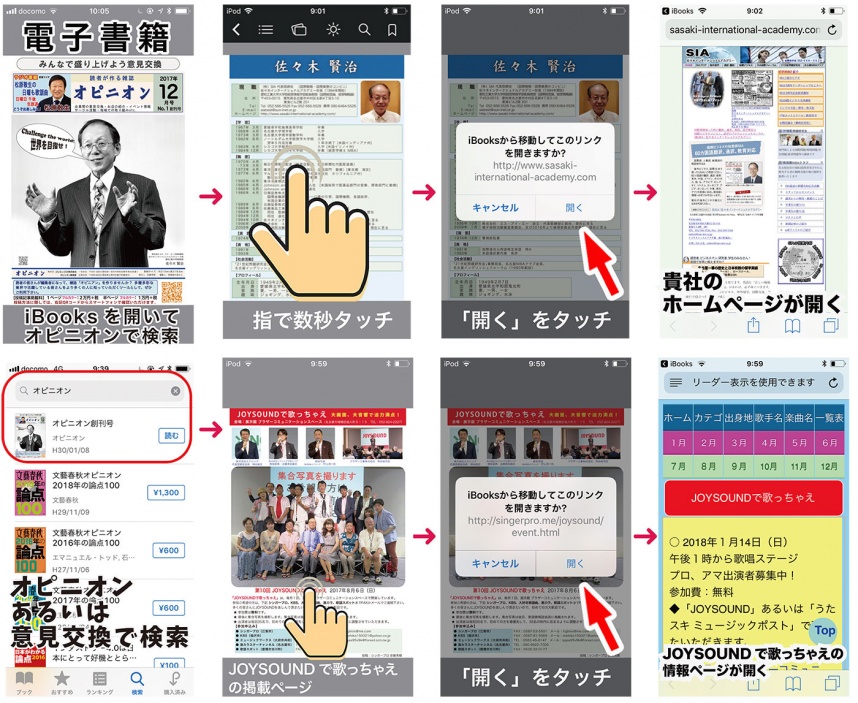 雑誌オピニオンに2万円の投稿記事を寄せられた方には、電子書籍版「オピニオン」に貴殿のホームページに跳ぶようにリンクを張ります。「JOYSOUNDで歌っちゃえ」の掲載記事をタッチすると「JOYSOUNDで歌っちゃえ」ご案内のホームページが開いて最新情報を見ることができます。