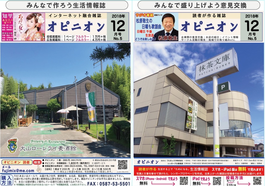 オピニオンの表紙は、お店の写真や芸能関係をはじめ業界で活躍している人物や団体等で飾らせていただきます。有料で表紙を飾る場合を優先いたしますが、選定させていただくことがありますのでご了承下さい。