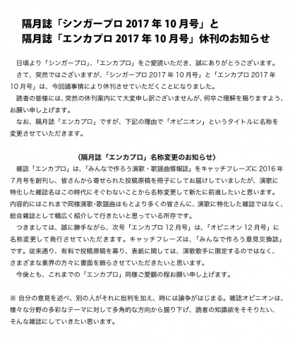 隔月誌「シンガープロ2017年10月号」と隔月誌「エンカプロ2017年10月号」休刊のお知らせ