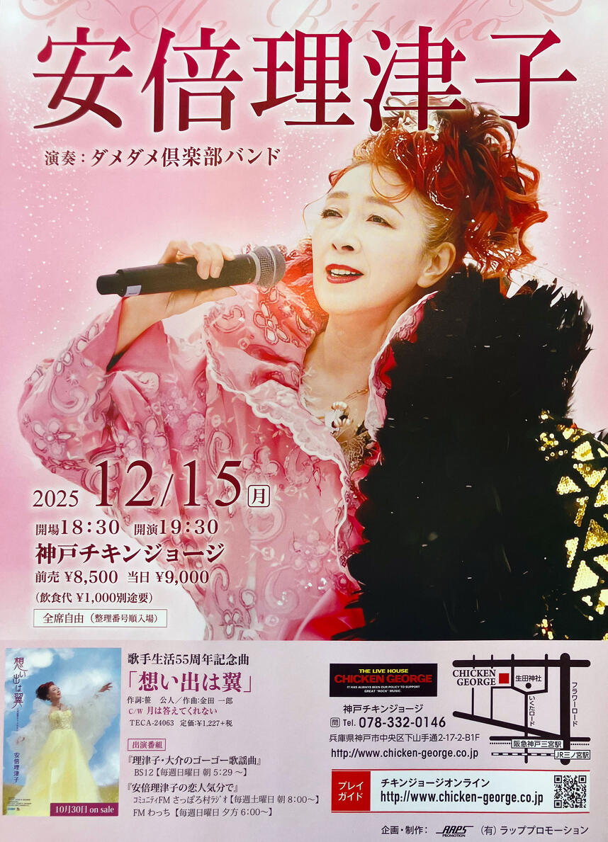 1983年、橋幸夫とのデュエット曲『今夜は離さない』で一世を風靡した安倍理津子のライブショーが、12月15日(日)に神戸チキンジョージにて開催されます。