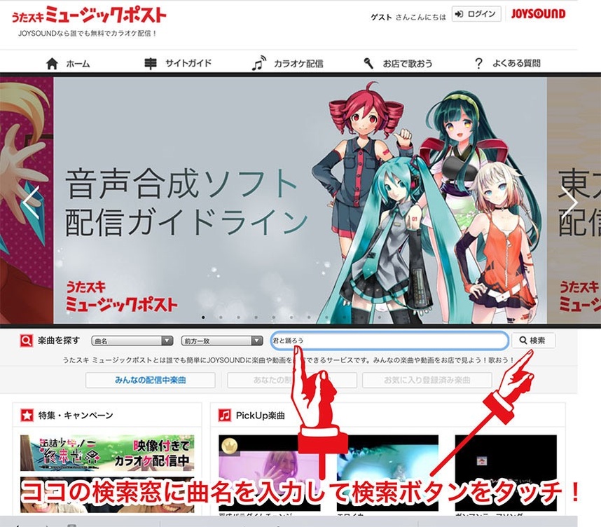 矢印の検索窓に曲名を入力して検索ボタンをタッチして下さい。