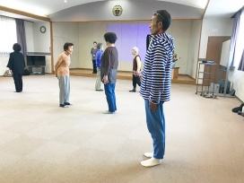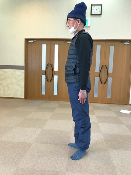 二人が一組になって、一人が完璧にいい姿勢だと思う姿勢をする。もう一人がその人の姿勢を側面からと正面から観察する。側面からみて耳の穴と肩の中央、もものつけねから膝から外くるぶしにかけて一直線上にあるか、おなかがでていないか、お尻が後ろに出ていないかをしっかり観察する。立位で肛門をきゅっと締めると、胸が引き上がるので、いい姿勢になったように感じる。これを行うと足の太ももと太ももの間が空いている人でも、それなりに内側に締まるとのこと。この状態をキープするのはかなりきついので、お腹の筋肉を鍛えていると言われると納得がいく。良い姿勢は、血液循環を良くして、肩こりや腰痛などの予防や解消に繋がる。美しい姿勢は外見的に恰好良く、若く見えるのも大きなメリット。気を緩めると猫背になりやすいので、時々は正しい姿勢を意識して体幹を鍛えると良いと思います。