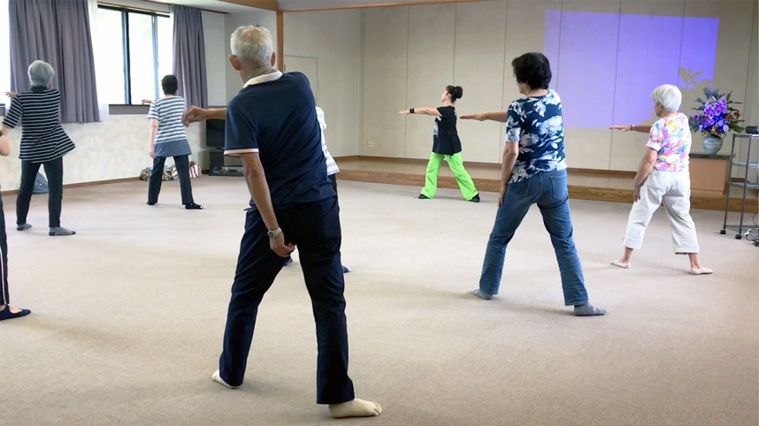 教室は、インストラクターの「ゆるめて左側に戻って反対だよ。そうそう大きく深呼吸して終わるよ。」