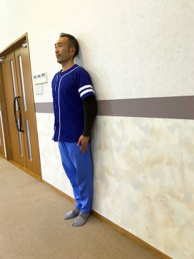 壁に背中をつけて、あごを引いた状態で、リラックスして立つ。この時にかかと、ふくらはぎ、おしり、肩、頭が、壁につけばOK。どこか一箇所でもつきにくい場合は、姿勢が悪いということ。