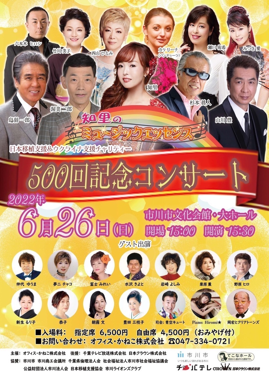 知里のミュージックエッセンス「500回記念コンサート」が6月26日(日)に市川市民文化会館(千葉県市川市)で開催されます。