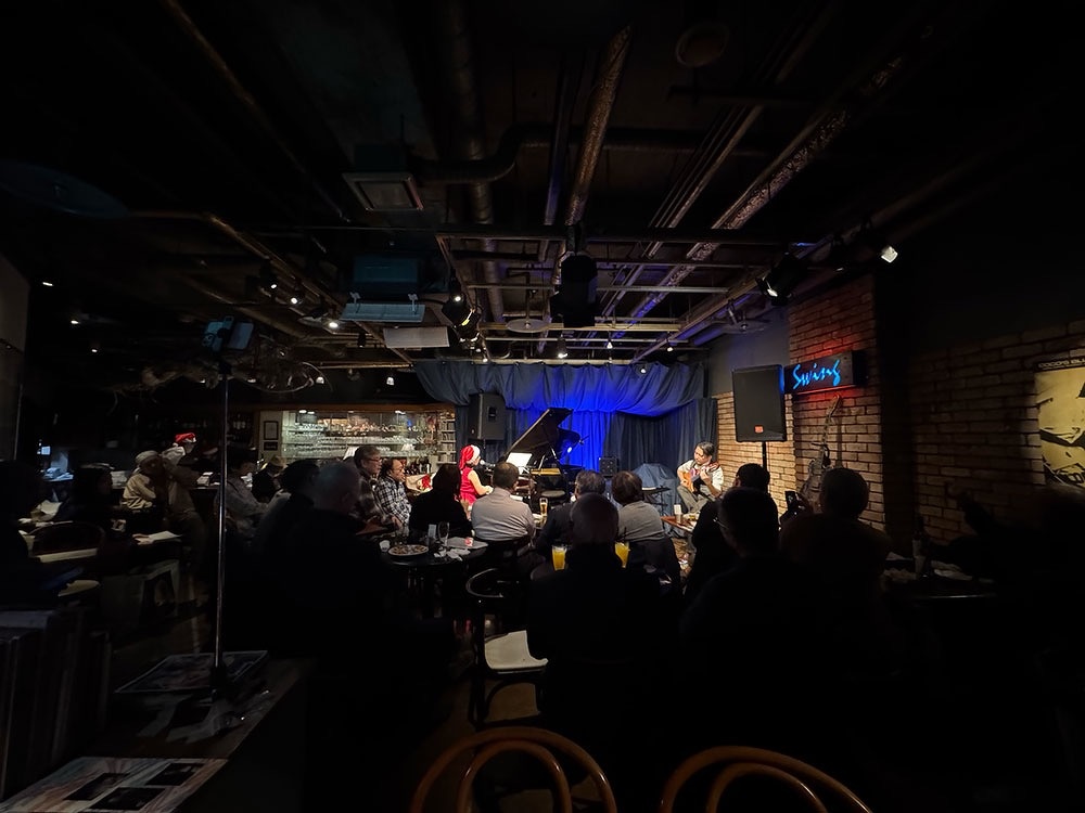 2025年12月20日(土)、名古屋市スウィングにおいて、エレノアシーと前田智洋氏によるクリスマスライブが開催された。会場のスタッフもエレノアシーもサンタ帽子をかぶり、クリスマスムードを盛り上げた。